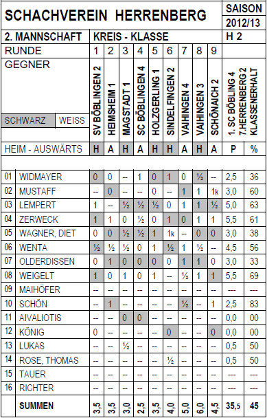 Beste Punktesammler waren Christoph Zerweck mit 5,5 Punkten und 61 Prozent sowie Rainer Lempert mit 5 Punkten und 63 Prozent.
